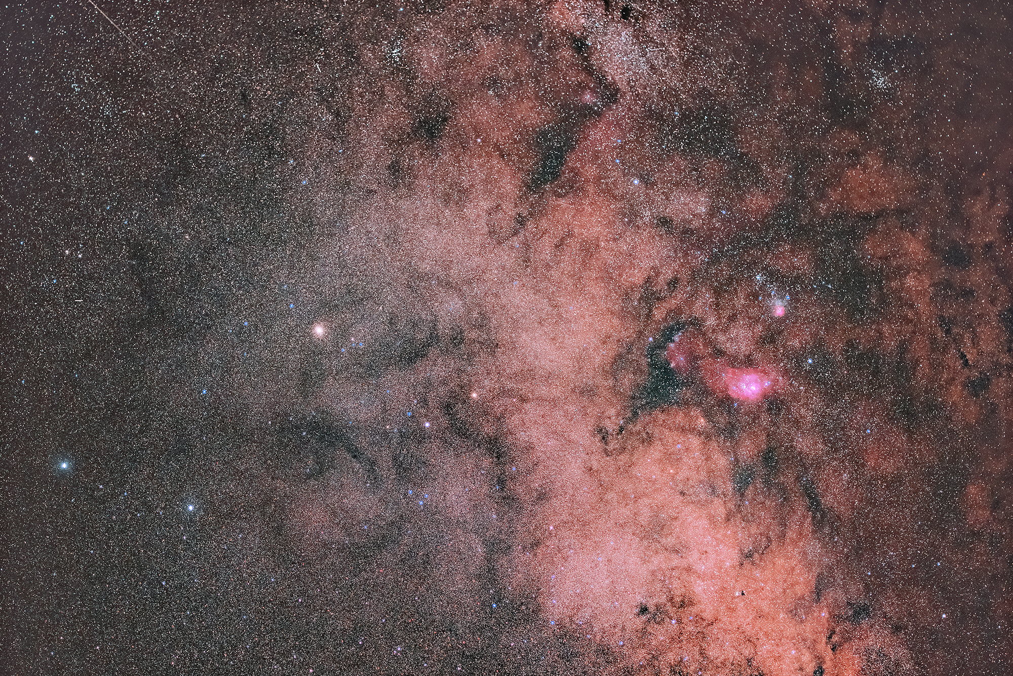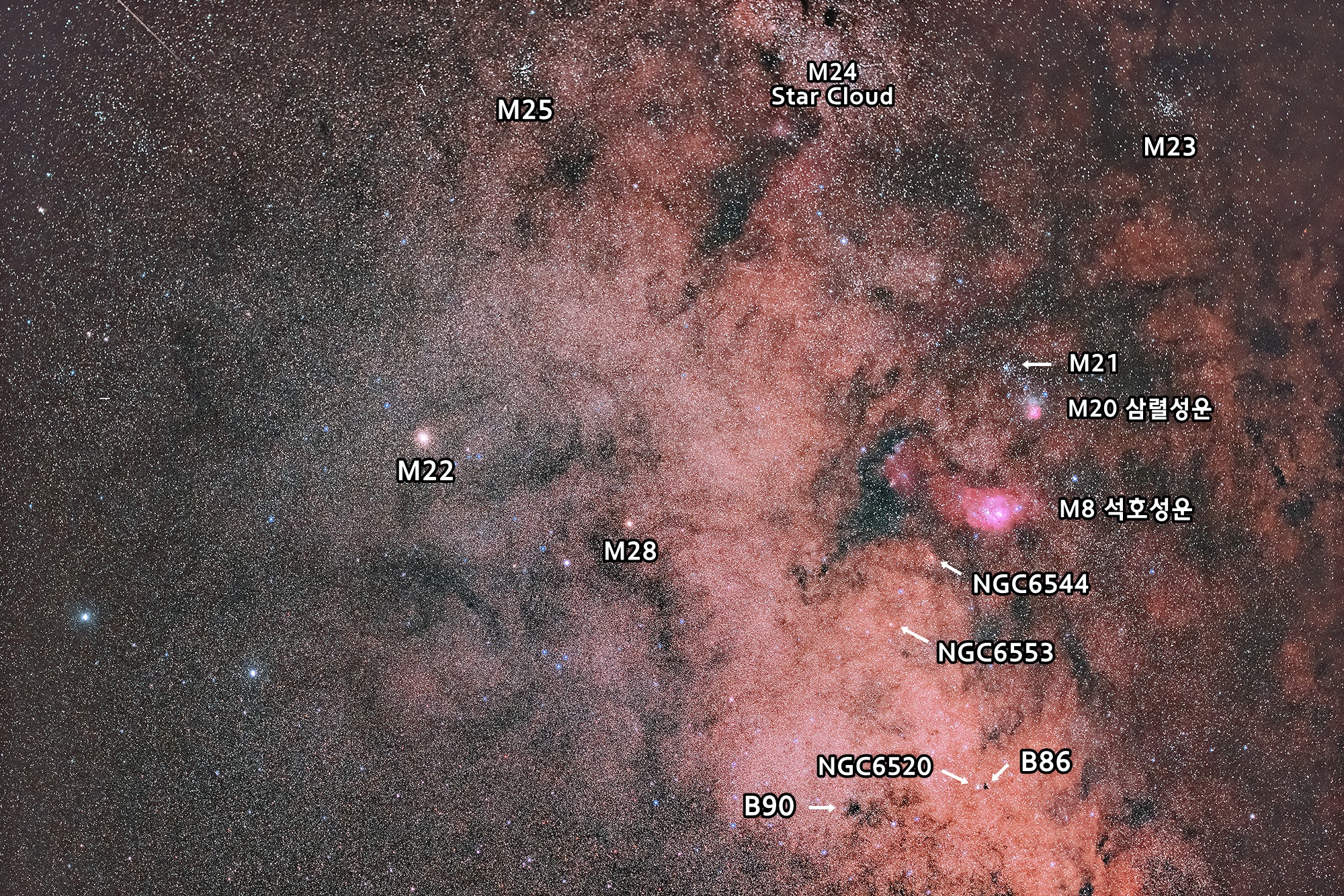 좋은 장소에서 맨눈으로 보면 마치 뿌연 구름처럼 보이는 은하수 중심부입니다. 우울한 장마철을 맞아 하드를 뒤적이다 찾은 이미지 한 장을 가볍게 만져보았습니다. 석호성운과 삼렬성운을 제외한 점 하나하나가 태양과 같은 항성이지요.