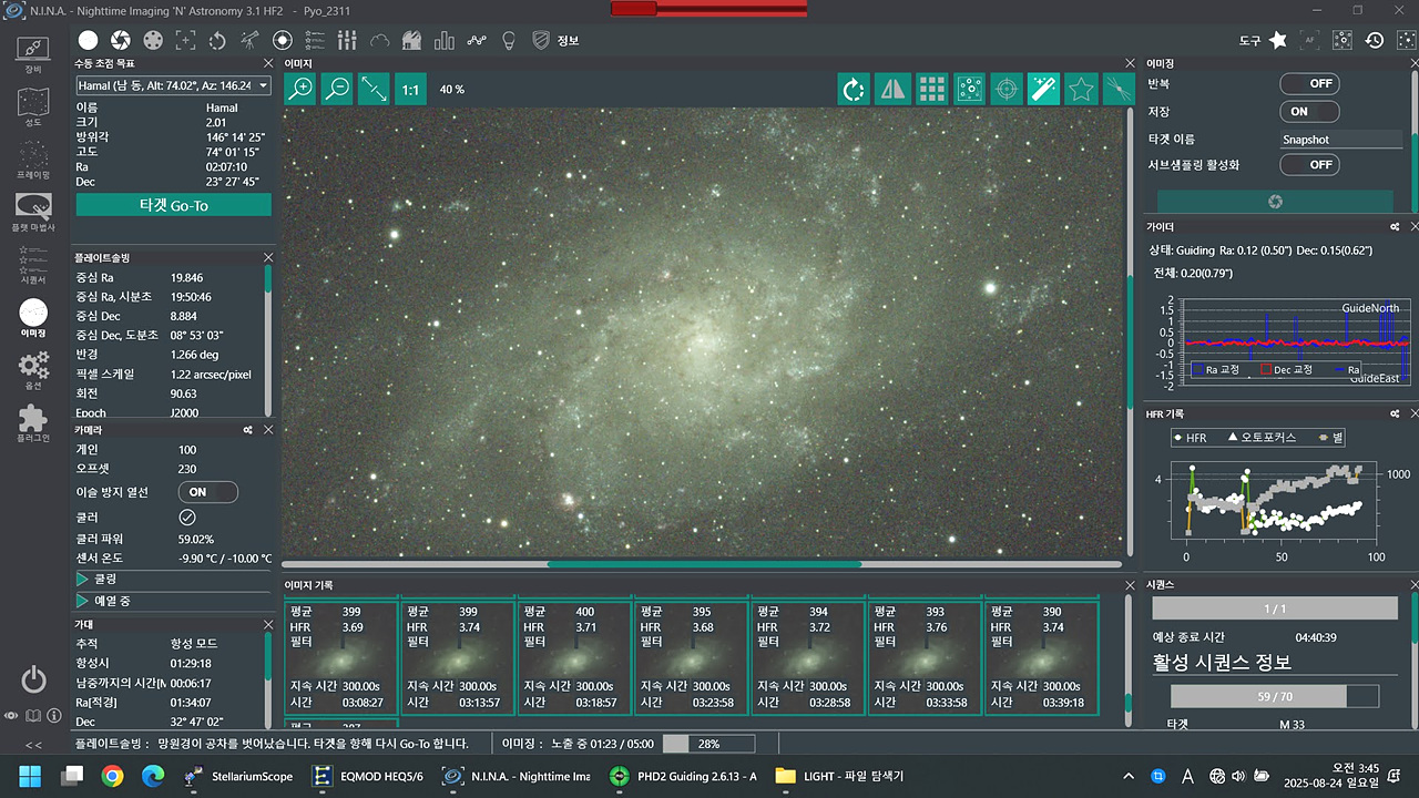 전날에 이어 M33 삼각형자리 은하를 담아보았습니다. 확실히 고지대여서 그런지 어제 촬영한 사진과 비교해보니 대략 2/3 정도 작아진 별상을 보여주더군요. 초점과 가이드 시스템을 확인한 후 새벽까지 연이어 촬영했지만 결과적으로 하늘을 가로지르는 연무와 다습한 하늘이 아쉬운 밤이었습니다. 아홉 시를 조금 넘긴 시각에는 차량 네다섯 대가 연이어 올라와 한 시간이 조금 넘는 시간 동안 레이저도 깜빡이고 플래시도 켜서 촬영 중인 망원경도 비추며 '하하 호호' 하면서 은하수를 찍고 내려가는 무리가 있었지만 그럼에도 불구하고 고즈넉한 산사의 풀벌레소리가 가득한 별밤을 온전히 즐길 수 있는 날이었습니다.