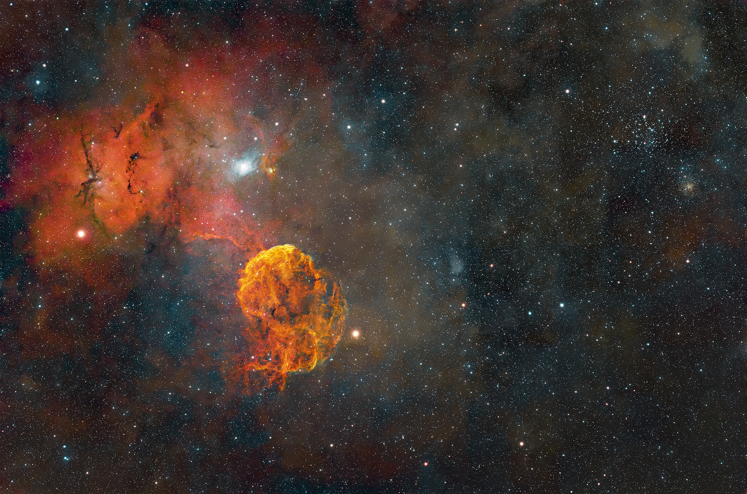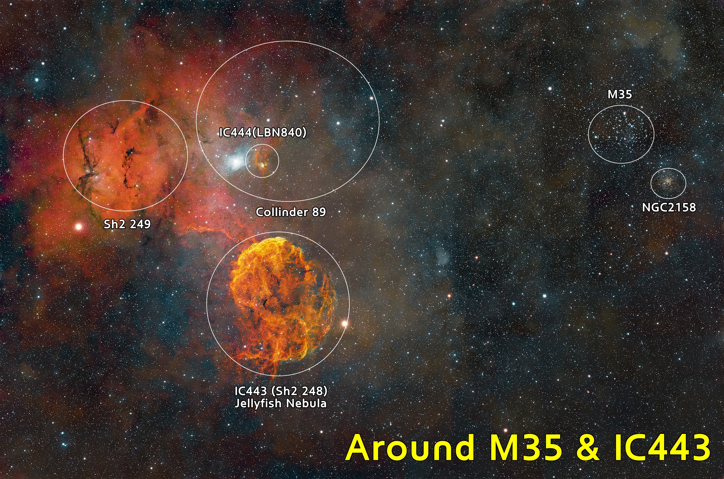 왼쪽이 독가스를 뿜어내는 해파리성운(Jellyfish Nebula)이고 오른쪽 상단이 M35 산개성단입니다. 산개성단 오른쪽 아래에 있는 구상성단은 NGC2158이지요. 간단한 주석을 첨부해 봅니다.